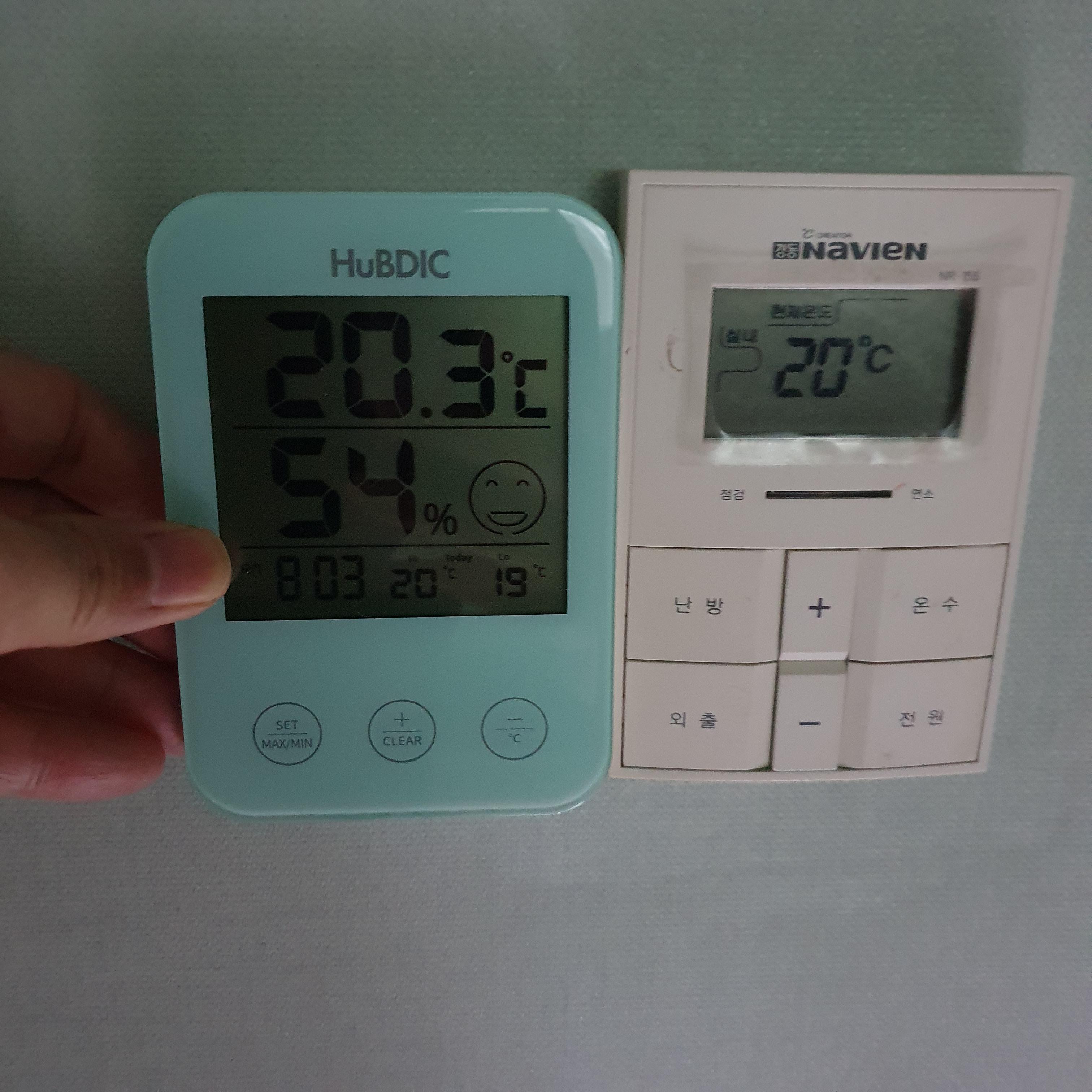 휴비딕 디저털 온습도계의 온도는 20.3도 나비엔 보일러의 온도는 20도 입니다. 보일러에 표시되는 온도의 단위는 소숫점 이상 자리까지 밖에 표시가 안되기 때문에 거의 비슷하다고 볼 수 있겠네요. 0.3 의 차이는 오차라고 단정하기 어렵기 때문에 보일러 온도 표시와 99% 일치하다고 볼 수 있겠습니다.