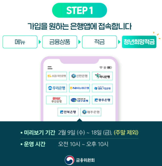 2022 청년희망적금을 취급하는 총 11개의 은행은 2022년 2월 9일 부터 2월 18일 까지 해당 은행의 APP을 통해 미리보기 서비스를 제공합니다. 이 서비스를 이용하여 적금 상품을 신청하게 되면 은행에서 제공하는 이벤트에 당첨될 가능성도 있으니, 이는 은행마다 적금 상품을 확인해보는것이 좋을듯 합니다.