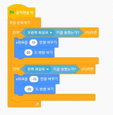 키보드 이동 블록은 무한반복하기 블록에 들어갈 수 없는데요. 때문에 무한반복 블록을 제어 메뉴에 있는 만약( )이라면 블록과, 감지 메뉴에 있는 (스페이스)키를 눌렀을때 블록을 이용합니다. 이 블록을 이용하면 왼쪽, 오른쪽 이동 기능을 만들 수 있습니다. 또한 위,아래 이동 블록은 이제 필요 없기 때문에 지워버립니다.