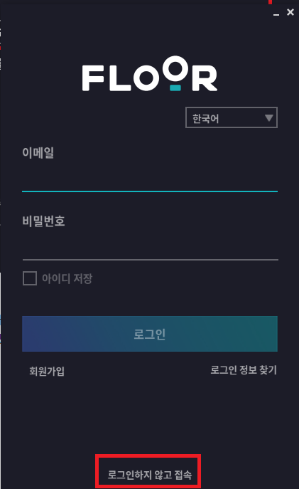 FLOOR 런처 설치가 완료되면 로그인 화면이 나오는데, FLOOR 계정으로 로그인을 해주거나, 계정이 없다면 회원가입을 한 후 로그인을 하시고, 로그인이 완료되면 런처가 실행되며 언디셈버 컴퓨터 모바일 게임을 시작할 수 있습니다. '로그인하지 않고 접속' 기능은 제가 시도하는 당시 작동이 잘 안되더라고요. 어차피 계정연동을 해야하니 회원가입 하시는것을 추천합니다.