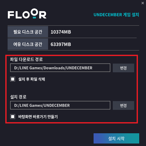 이번에도 런처 설치와 마찬가지로 필요한 경로를 지정하거나, 필요한 옵션을 체크한 후 '설치시작' 버튼을 클릭하여 언디셈버 PC 설치를 시작해보겠습니다.