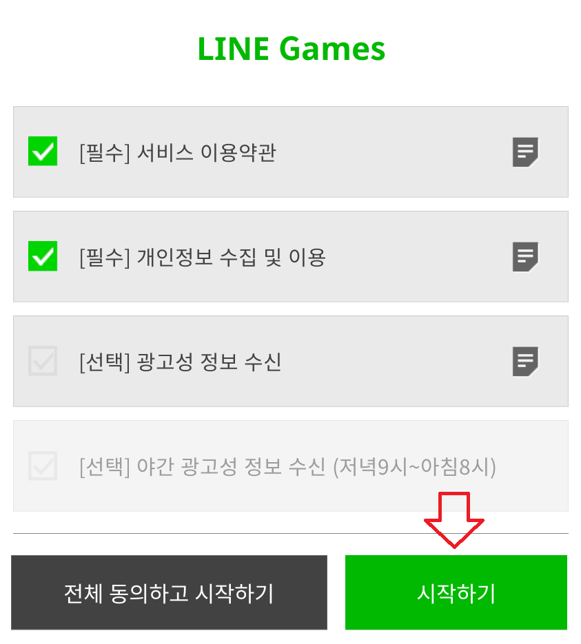 필수약관에 체크를 하고, 선택 부분은 원하는것만 체크한 후 시작하기 버튼을 클릭합니다.